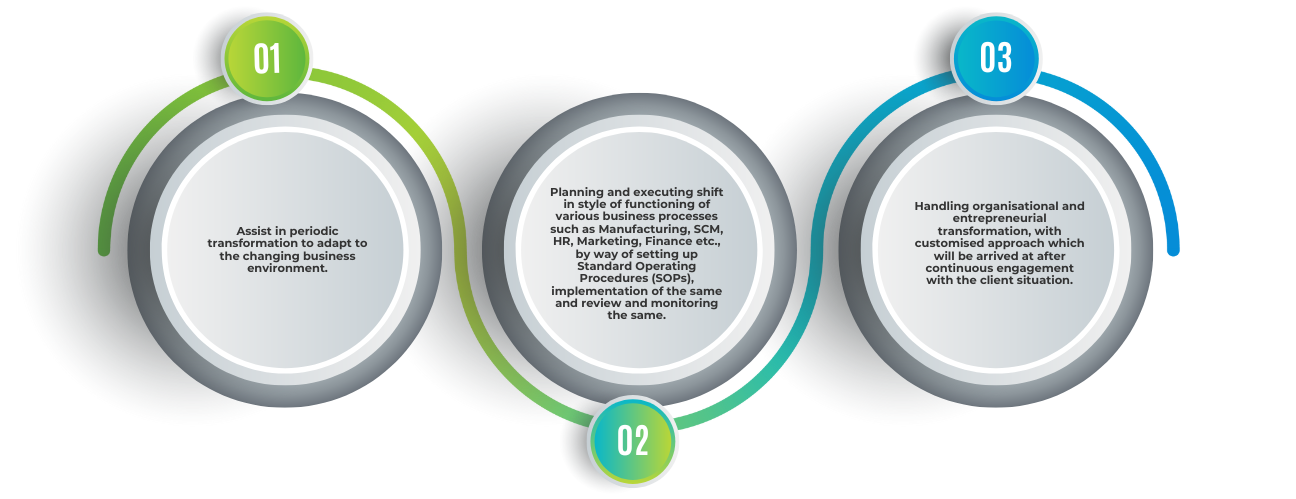 Entrepreneur driven and family run businesses will require a periodic transformation in order to adapt to the changing times and environment. This would envisage thorough shift in style of functioning of various business processes such as HR, Marketing, Finance, Management, etc. All these processes have to be handled in such a way that there is proper integration to achieve the common corporate objectives and goals.
